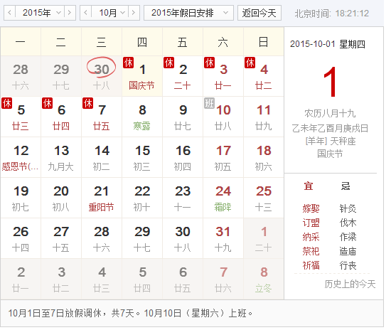 2015年中秋国庆节放假安排